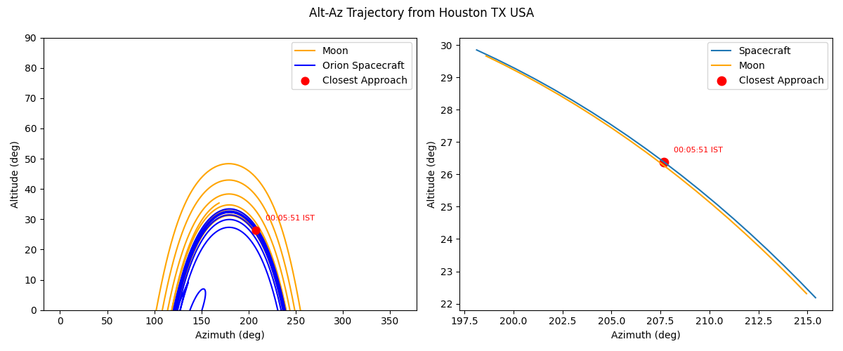 The following figure captures the trajectory of the spacecraft (blue) and the Moon (orange) as seen in the sky from Houston, Texas, USA. The red point illustrates the location in the sky where the spacecraft reaches its furthest point from Earth, occurring at 12:05p.m. IST (7:05p.m. ET).