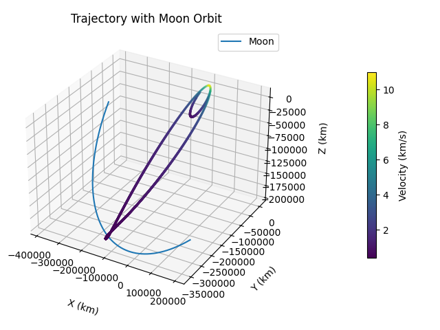 The velocity magnitude of the spacecraft is represented using a colour map. We can see it is the brightest around the perigee point, the point closest to the Earth. This occurs because Earth’s gravitational pull is strongest at this point, causing, the spacecraft to accelerate and reach its maximum kinetic energy. As the spacecraft moves away from Earth and continues its trajectory toward the Moon, it gradually exits Earth’s dominant gravitational influence, and its velocity decreases.